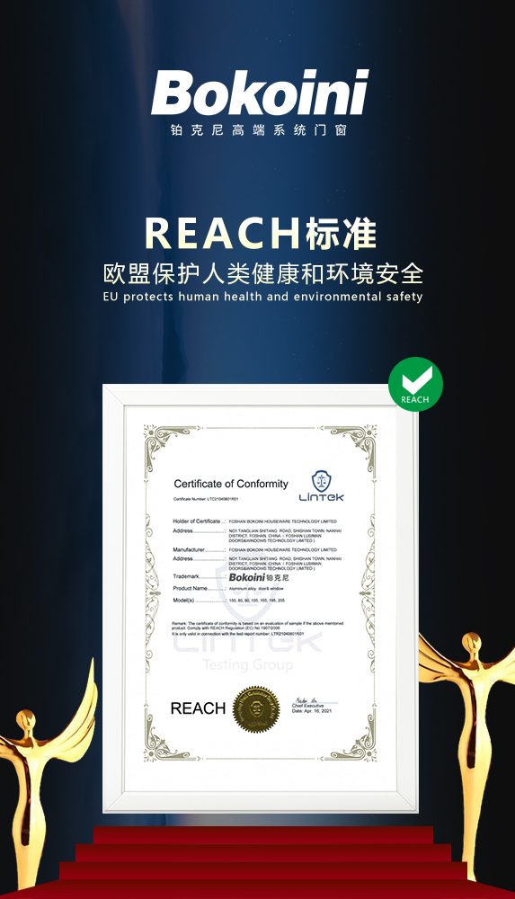 近日,铂克尼门窗全系列产品经权威机构严苛检测后,均符合相关标准荣获欧盟REACH认证, 这是在铂克尼门窗荣获CE与欧盟REACH双认证又一荣誉见证! 标志着铂克尼门窗所生产的产品已达国际标准合格水平,再次肯定铂克尼门窗在环保及质量上的认可!