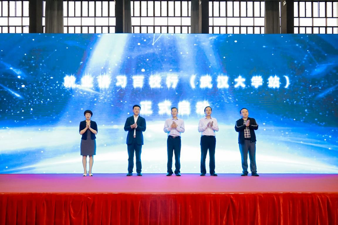 中国青年创业就业基金会副秘书长王松山、武汉大学党委副书记屈文谦、共青团湖北省委副书记方清忠并与武汉市人才服务中心党委书记、中心主任熊军、中航信托股份有限公司副总经理张瑰共同启动活动。