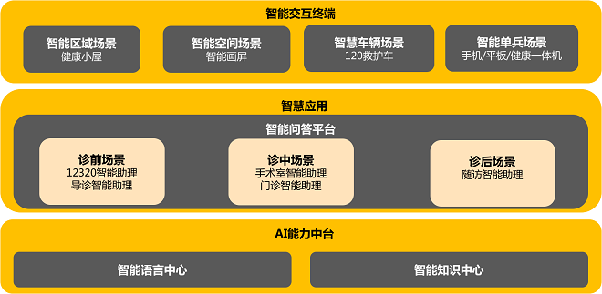 在智能语言中心和智能知识中心的已构建完成的基础上,“1+2”智慧方案构建为医院不同角色用户提供服务的智能问答平台。