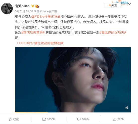从前期的悬念预热到正式官宣日,再到5月20日片仔癀化妆品与官鸿共同打造的首支功夫TVC释出,片仔癀化妆品此次代言人官宣在微博平台引起不少讨论,美妆类、生活方式类、娱乐类等多元领域KOL以及众多KOC均纷纷发布元气满满的内容进行热议。520当天,与此相关的#官鸿功夫首秀#话题更是微博登上热搜榜。同时在#亮出你的深功夫##官鸿功夫首秀#的话题下及官鸿超话里,用户及粉丝的讨论热度也是逐日发酵升温,仅在官宣微博下方的评论留言便已达上万条。而上映的功夫TVC也是获得了诸多微博大号的点赞与转发,吸引了众多目光。