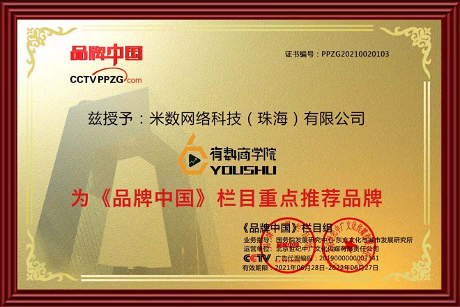 2021年6月28日,米数网络科技与《品牌中国》栏目达成全面战略合作,并在米数网络科技(珠海)有限公司举行签约仪式并正式授予牌匾。