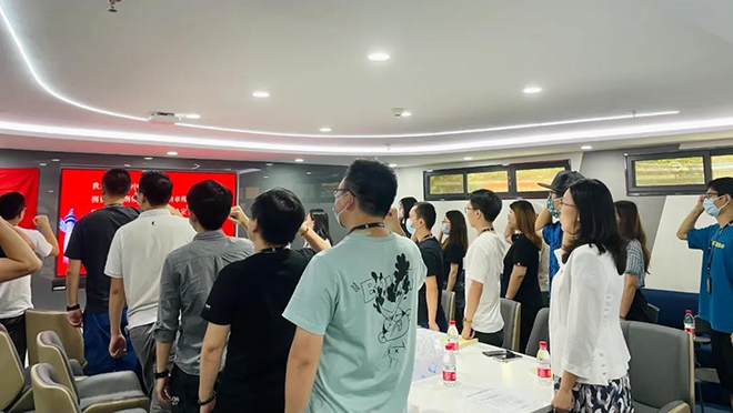 面向鲜红的中国共产党党旗,举起右拳,支部全体党员庄严宣读入党誓词。