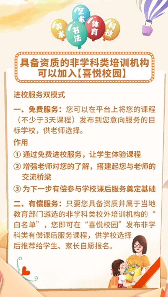 据悉,8月28日起“喜悦校园”平台将接受具备资质的社会专业人员或志愿者,以及教育部门链接或举荐的非学科类校外培训机构发布服务内容,供学校选择使用。