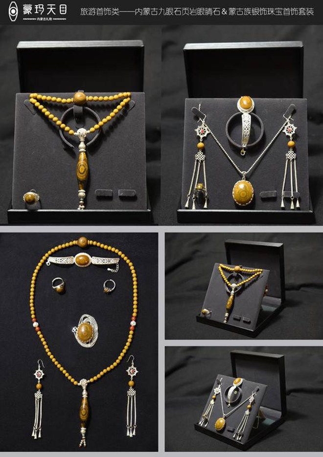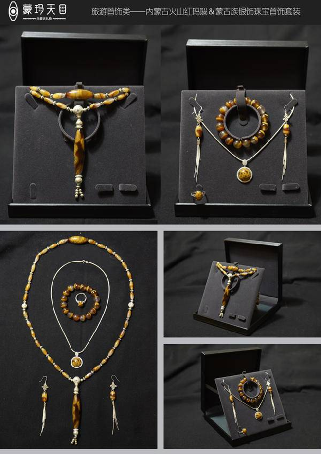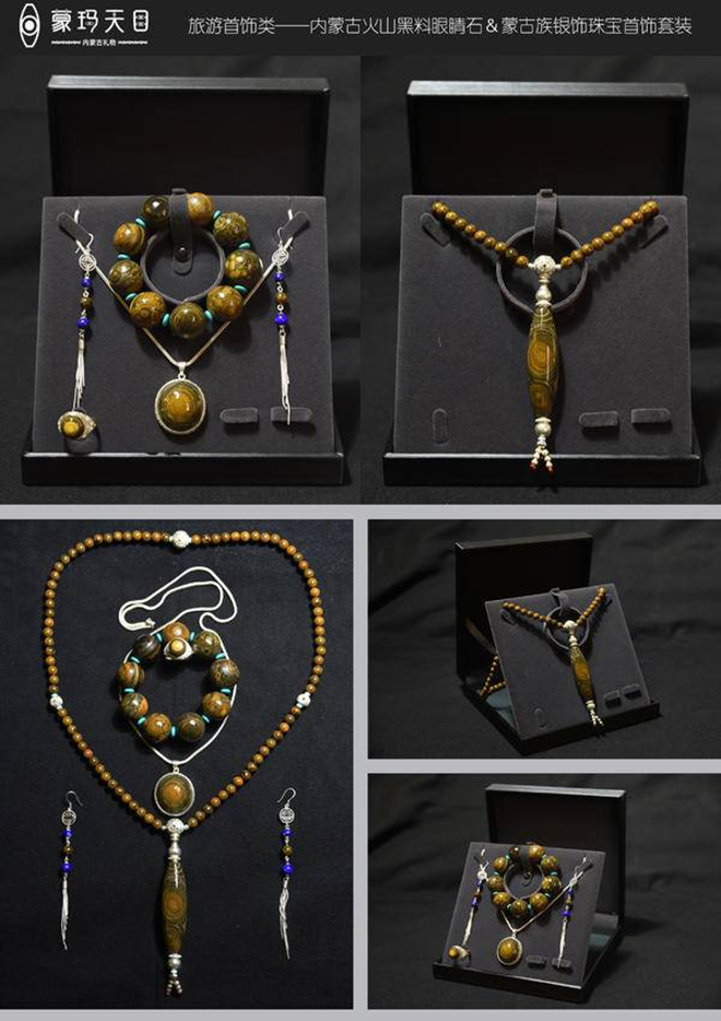 获奖作品——蒙玛天目火山眼睛石和蒙古族银饰珠宝首饰套装