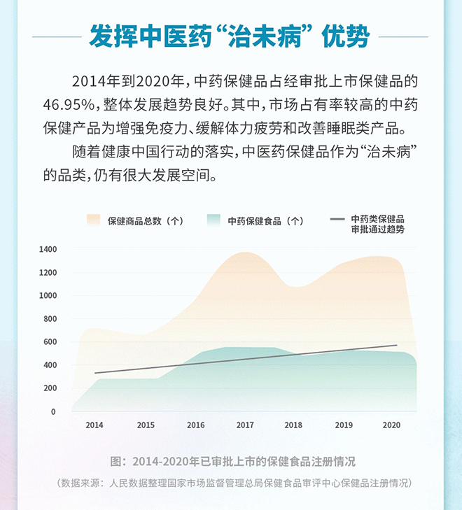 在2014年,卫健委、国家中医药管理局联合发布了《中国公民中医养生保健素养》,将中药保健、药食同源列入保健素养基本理念与知识。在2016年,国务院印发《中医药发展战略规划纲要(2016-2030)》,将中医药发展列入国家战略,并鼓励中医药机构充分利用生物、智能等现代技术,研发一批保健食品、保健用品和保健器材。随着“健康中国行动”的落实,中医药保健品作为“治未病”的重要品类,具有很大发展空间。