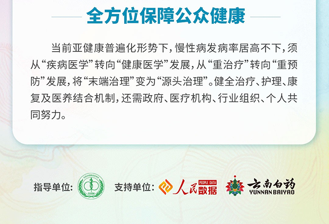 当前老龄化形势日益严峻,慢性病发病率居高不下,须从“疾病医学”向“健康医学”发展,从重治疗向重预防发展,将“末端治理”变成“源头治理”。健全治疗、护理、康复及医养结合机制,是政府、企业、医疗机构、个人需要共同努力的。
