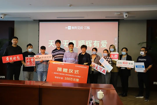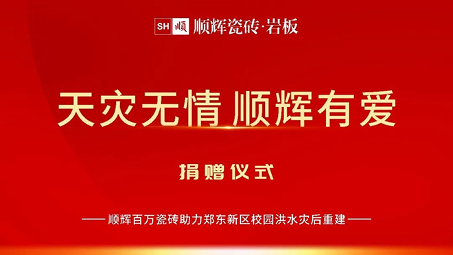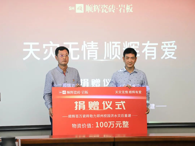 9月26日,顺辉瓷砖助力郑州校园灾后重建捐赠仪式在郑州市金融智谷郑东新区教育局会议大厅举行。顺辉瓷砖捐赠价值100万元的瓷砖物资,捐赠于郑东新区教育局,为洪水灾后的郑州校园重建添瓦加砖,保障受灾地区学生们的教育与生活环境。