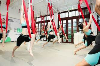 来宾们现场体验空中瑜伽精品课程