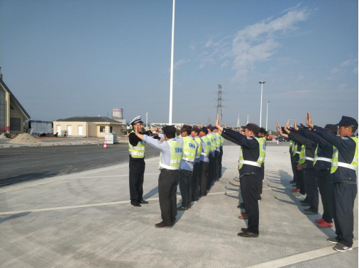 衢州高速交警一大队徐大带队指导,现场示范了交通指挥手势的动作要领,并以对练实操的方式,一一矫正保安员们的姿势和动作,同时为保安员们讲解了在大流量的情况下如何布点,如何快速引导车辆,还对服务区如何快速处置车辆事故等突发事件引发的道路堵塞进行了经验传授。