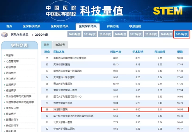 10月31日,代表中国医学科研创新能力最高水平的2020年度中国医院/中国医学院校科技量值正式发布。在全国1634家医院中,潍坊眼科医院位列第29位。