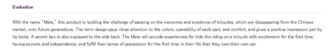 这款名为“Mate”的产品正在应对将“中国市场上正在消失的三轮车的记忆和存在传递给后代”的挑战。复古设计注重色彩、各部分的可操作性和舒适性,仅凭外观就能给人积极的印象。在车身背后还配备了一个秘密盒子。“MATE”将为孩子们提供第一次骑三轮车的兴奋体验,神秘又独立,满足他们生命中第一次拥有自己小车的占有感。
