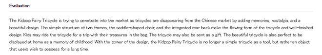 而kidpop从6000余件产品中脱颖而出,MATE、FAIRY成为此次奖项唯二的“儿童三轮车”类目获奖作品,RIGHT成为唯一的“平衡车”类目获奖作品,并不是巧合与幸运,而是设计与实力的彰显。