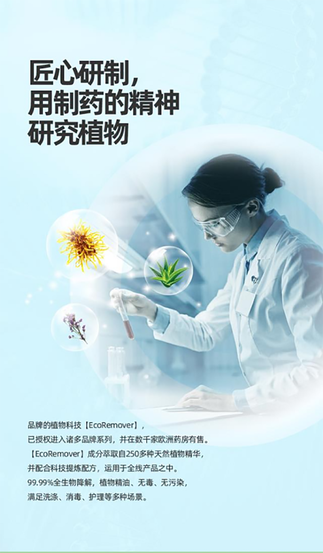 为了研制出更适合人们日常使用的清洁剂,创始人彼得从250种植物中萃取的有效成分,释放天然清洁力量。采用独有科技EcoRemover复合植物配方制作出来的神奇1000有机清洁剂,其PH值呈中性,不含过敏原香料,最终可生物降解,不会给人、家庭、地球造成伤害,堪称新一代绿色清洁洗护专家。