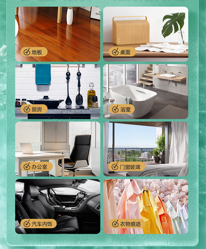 在家庭生活或日常办公的多重场景下,一瓶神奇1000有机清洁剂就能搞定。不管是地板、桌面、厨房、浴室、门窗玻璃、衣物痕迹,还是办公室,甚至是汽车内饰,均可以使用神奇1000有机清洁剂进行清洁。