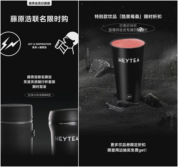 除了通过直播向粉丝分享品牌信息外,喜茶会员日直播活动还是“实力宠粉现场”,各种福利不断。在本次直播中,喜茶全渠道首发了和藤原浩联名的茶渣灵感随行杯套装。这款备受关注的联名周边产品在直播间中上架即被秒光。此外,喜茶还带来了最新的藤原浩特别款饮品“酷黑莓桑”预售饮品券、会员日专属限定礼品卡、轻芒芒甘露单杯券、清爽不喝腻系列饮品券等福利。
