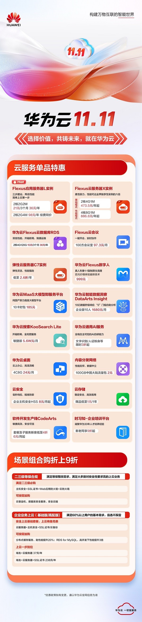 在爆款产品中,华为云Flexus云服务“全家桶”覆盖了计算、容器部署、数据库管理、营销服务等全链路、全场景产品及服务。其中,Flexus X实例是业界首款应用驱动的柔性算力云服务器,算力强劲,提供友商最新旗舰级云服务器的算力性能,还支持X-Turbo加速等技术,关键业务应用性能出色;Flexus L实例是轻量级云服务器,具有智能不卡顿、价优随心用、上手简单、管理省心等优势;轻量化设计的Flexus云数据库RDS,确保数据管理安全可靠、简单高效;Flexus云容器CCI让企业轻松拥抱云原生;Flexus云会议凭借在远程办公、会议培训、AI能力、高清稳定等方面的优势成为企业级必备云会议产品。