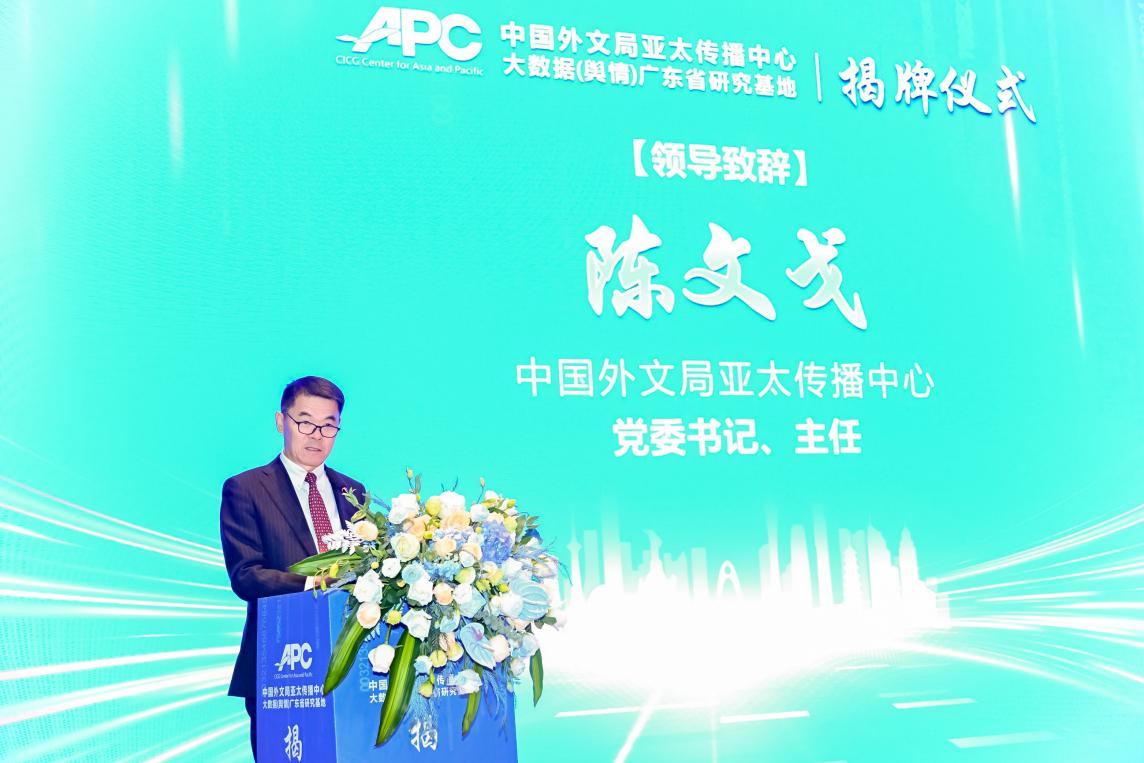 陈文戈在致辞中表示,成立广东省研究基地是中国外文局亚太传播中心服务地方发展的关键举措,具有重大而深远的战略意义。广东省研究基地未来将为广东经济社会的高质量发展提供科学、高效、创新的有力支撑,为广东省的对外交流合作、品牌创新塑造、社会和谐稳定提供有力保障。