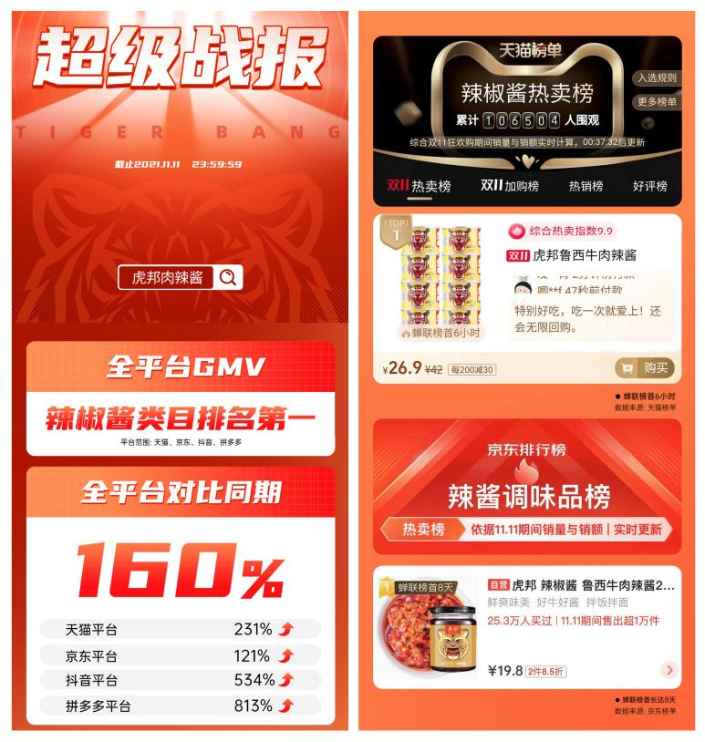 除外卖及线下餐饮渠道外,虎邦敏锐察觉国内电商发展势头,打造了以天猫、京东为核心,兴趣电商(达人直播、社区种草)为辅助的渠道矩阵。并于2019年销量突破1亿罐在各大电商平台稳居前三,2021年双十一期间,实现电商全平台GMV辣椒酱类目第一名。