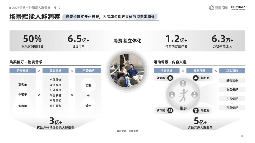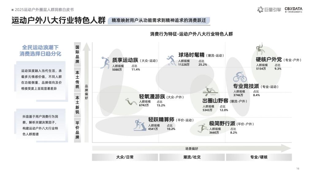 兴趣内容聚合细分场景,圈层画像指引消费增长潜力。抖音构建立体化场景,帮助品牌更好地理解运动消费者。抖音运动户外八大行业特色人群全新发布,依托科学数据模型精准刻画行业消费决策链路,为品牌提供垂直领域深度洞察与人群策略抓手。基于内容生态,巨量引擎联合 CBNData 归纳十六大圈层人群,二者叠加打造精细化圈层人群图谱,实现洞察 - 营销 - 转化 - 追踪全链路打通。