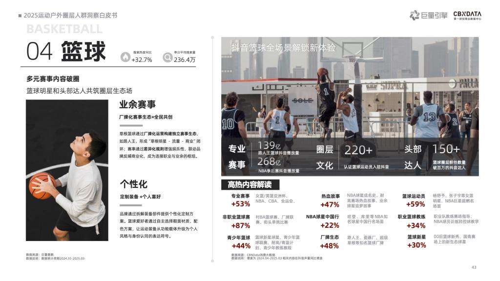 篮球圈层则呈现出明星效应与智能化共同驱动的趋势,爱好者们因热爱相聚,在团队协作中收获成长、友谊与归属感。装备选购上,TA 们兼具实战刚需与潮流时尚,专业篮球场景下 TA 们追求顶尖科技与精准适配,草根篮球场景下潮流设计与实战性能成为主要考量点,校园篮球场景中兼具青春活力与实用防护则是关键,三大细分场景共同构成跨年龄与专业深度的多维应用场景,展现了篮球圈层的消费潜力。