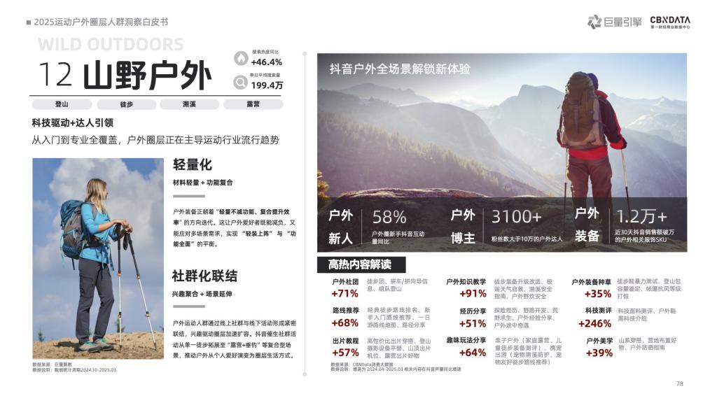 抖音户外爱好者们将户外运动作为周期性自然探索仪式,注重过程中的自我突破与情绪疗愈,并具有较强的社群依赖性。圈层聚集,场景细分,山野户外圈层进一步延伸出登山、徒步、溯溪、露营四大核心场景,景区登山、进阶登山及专业登山等细分场景。在装备选择上,TA 们的消费逻辑以功能性驱动,基于场景需求选择装备,用科技适配守护户外安全。