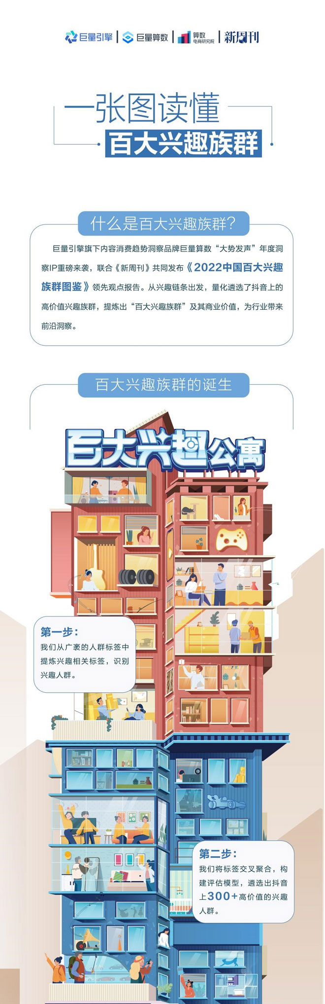 今年,巨量引擎旗下巨量算数联合《新周刊》共同发布《2022 中国百大兴趣族群图鉴》,从2.4 亿高活跃抖音用户中,提炼出了103个“高价值兴趣族群”,并根据他们身上所呈现出的异同,分析当代青年以“兴趣”为导向的生活方式。