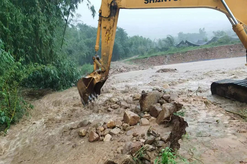 22日上午,雨势未见弱减。在英城街道廊步村,项目部人员在施工现场了解受灾情况时发现,若周围河道出现了堵塞,不及时疏通将有可能引发山洪,对下游的村庄造成巨大影响。为保护下游群众生命财产安全,项目部立即调配挖机对河道进行紧急疏通。最终,洪水顺利过境,廊步村村民的房屋完好无损,乡亲们悬着的心终于放下,连声称赞:“感谢中国铁建!有你们在,我们就安心了!”