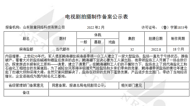 目前,剧本已经完成报备,并被列为山东省优质电视剧项目【滨州市重点项目】,2022年3月16日国家广电总局进行了备案公示。