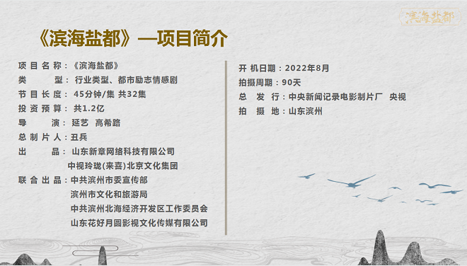 为了展现新中国盐业事业发展的不平凡历程,讴歌几代盐业人心系国家、舍小家顾大局、无私奉献、勇于拼搏的可贵品质和高尚情操,由山东省滨州市委宣传部、山东新章网络科技有限公司、中视玲珑(来喜)北京文化集团有限公司、山东花好月圆影视文化传媒有限公司联合策划了电视连续剧《滨海盐都》。该剧既是一部弘扬爱国主义、集体主义、社会主义的主旋律电视剧,同时也是我国第一部全景式展现新中国盐业事业发展的电视剧作品。符合当前国家关于大力倡导主旋律作品,宣传社会主义核心价值观的政策要求和导向,具有深远的历史意义和强烈的现实意义。
