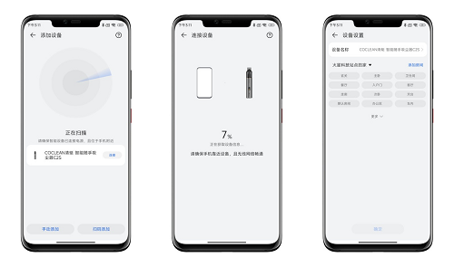 使用内置鸿蒙系统的手机,蓝牙开启模式下,只需要点亮屏幕并且靠近智能随手吸尘器C2S,在手机上就可以自动弹出清蜓智能随手吸尘器C2S的连接界面;