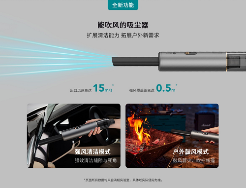 通过对产品本身功能边界的不断拓展,清蜓智能随手吸尘器C2S除了家用、车载,更满足了时下流行的户外野营需求,而这也是对无线吸尘器的一次全新探索。只需将缝隙吸头安装在吸尘器尾端位置,则可以变身成为一台鼓风机,满足吹营扫帐,鼓风篝火的户外需要。