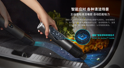 智能随手吸尘器C2S采用11万转高速无刷数码马达,搭载“动力控制芯片”以感知气流变化,利用清蜓独有的智能感知变频技术,自动调整吸力。