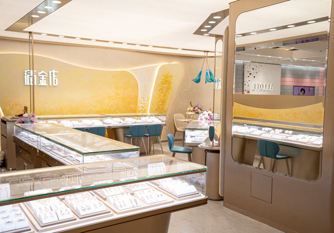 润金店艺术臻品馆在格局上,强化了整个门店区域的功能性与艺术性,由圆融的曲线与对称线条构成,并延续了自然优雅的花卉设计元素,作为主要的品牌元素,花卉元素的应用,不仅体现在润金店的产品设计上,也体现在装置、墙面和海报等装饰上。这些装饰不仅展现出润金店品牌对美的审视,也传递出舒适和亲和力,让门店的立体形象与有条不紊的、文雅优美的曲线融为一体,加上温暖的灯光以及明快的色彩组合,营造出一种没有距离的高级感。