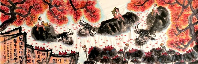 2021年,农历辛丑牛年,是中国共产党成立100周年,也是“十四五”开局之年。在这个重要时刻,著名书画家石山石创作了《中国牛》百米百牛长卷图于各地巡展。《中国牛》长100米、宽100厘米,由100头形态各异、栩栩如生的牛组成,弘扬了“中国牛”精神,这也是石山石先生作为一个艺术家向建党百年华诞的献礼。