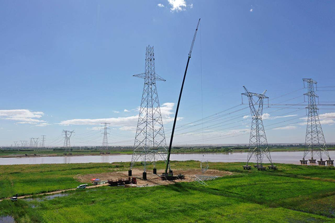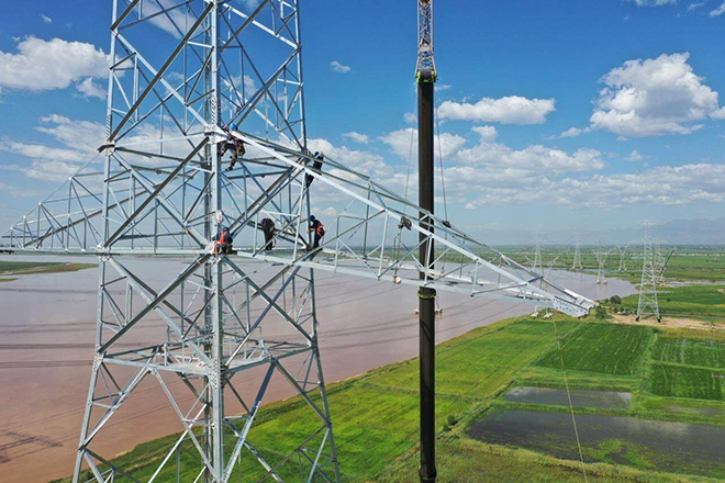 据悉,该工程静态投资逾6亿元,工程于2019年12月25日开工建设,2020年11月14日带电投入运行。全线采用同塔双回路架设,新建杆塔147基,其中双回路直线塔111基,双回路耐张塔36基。为确保创优,该工程不断提升建设工艺。一是加大技术创新,优化生产工艺,提升工程设计质量,全过程采用三维数字化设计技术。二维、三维联动完成杆塔排位及优化,三维场景下实现电气间隙校验、杆塔碰撞检查。二是大力推广应用机械化施工工法,实现了临时道路修筑、基础开挖、铁塔吊装、导地线架设等各阶段全机械化施工,提高了基础成孔效率、质量及铁塔吊装安全性,切实起到了“机械减人、机械代人”的作用。三是基础浇筑一次成型,无二次抹面修饰现象,表面无麻面,成品效果良好。同时为避免外露式高承台灌注桩基础对黄河水流状态产生影响,本工程创新性采用地埋式低承台灌注桩基础。