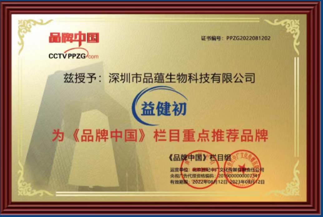8月12号,《品牌中国》兹授予:深圳市品蕴生物科技有限公司旗下品牌“益健初”重点推荐品牌