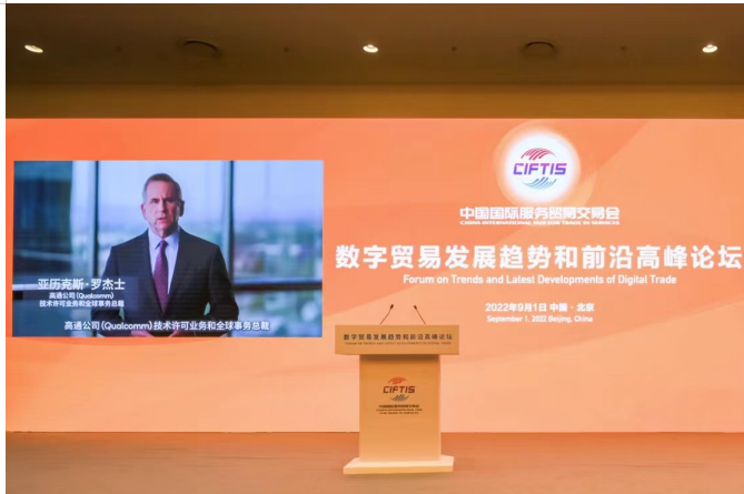 高通公司技术许可业务和全球事务总裁亚历克斯·罗杰士(Alex Rogers)在2022服贸会“数字贸易发展趋势和前沿高峰论坛”上发表视频演讲