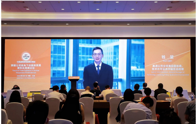 高通公司全球高级副总裁、技术许可业务中国区总经理钱堃在2022服贸会“跨国公司视角下的服务贸易便利化高峰论坛”上发表视频演讲