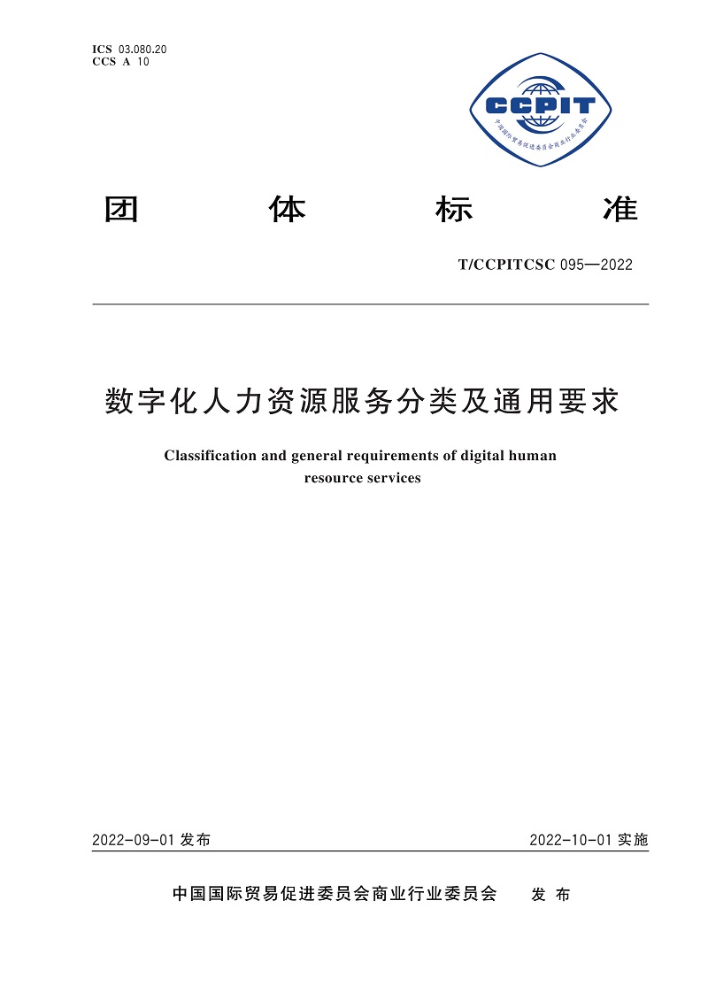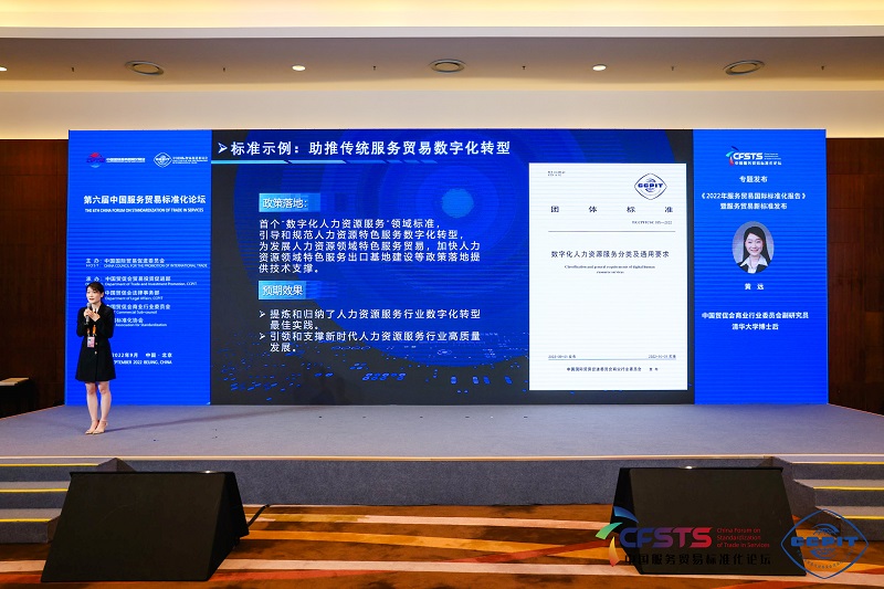 9月4日,作为中国国际服务贸易交易会期间唯一的标准化领域专题论坛,由中国贸促会商业行业委员会主办的第六届中国服务贸易标准化论坛在北京国家会议中心举行。论坛上,作为行业首个“数字化人力资源服务”领域标准——《数字化人力资源服务分类及通用要求》(标准号:T/CCPTITCSC 095-2022)团体标准正式发布,并于同年10月1日正式实施。