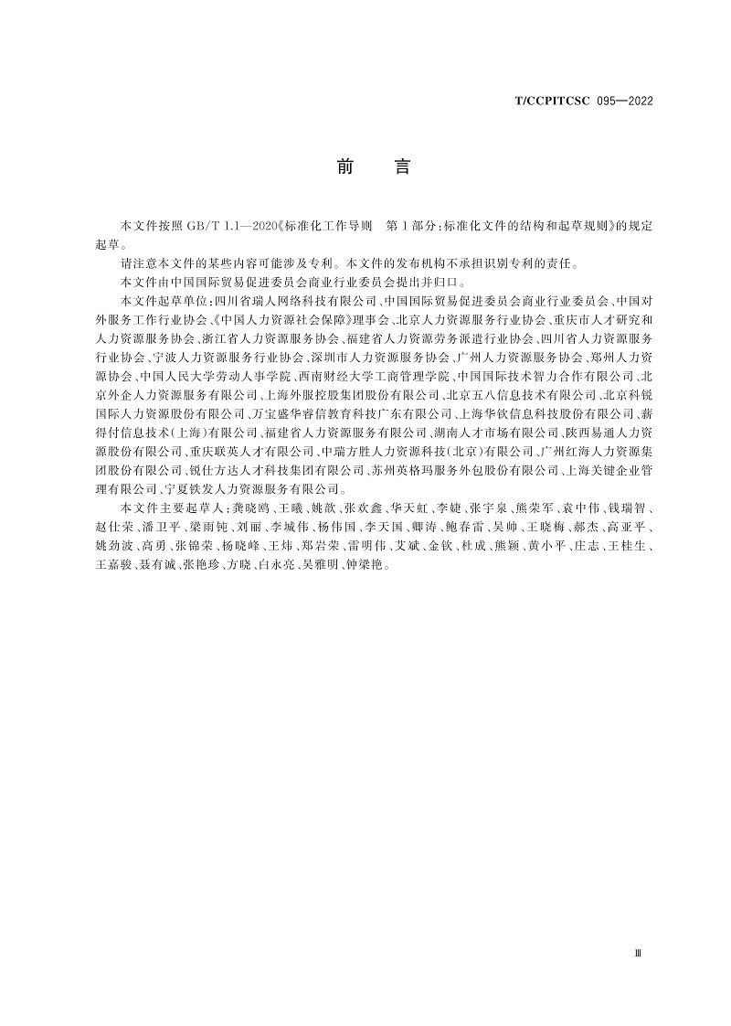 《数字化人力资源服务分类及通用要求》团体标准由瑞人云携手中国国际贸易促进委员会、中国对外服务工作行业协会、《中国人力资源社会保障》理事会、北京人力资源服务行业协会、中国人民大学劳动人事学院、中国国际技术智力合作有限公司、上海外服控股集团股份有限公司、北京外企人力资源服务有限公司、北京五八信息技术有限公司、北京科锐国际人力资源股份有限公司、万宝盛华睿信教育科技广东有限公司等全国及地方人力资源服务行业协会、知名高校及科研院所、龙头企业、行业专家学者共同起草。