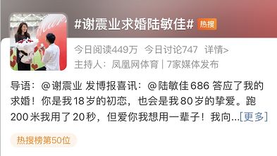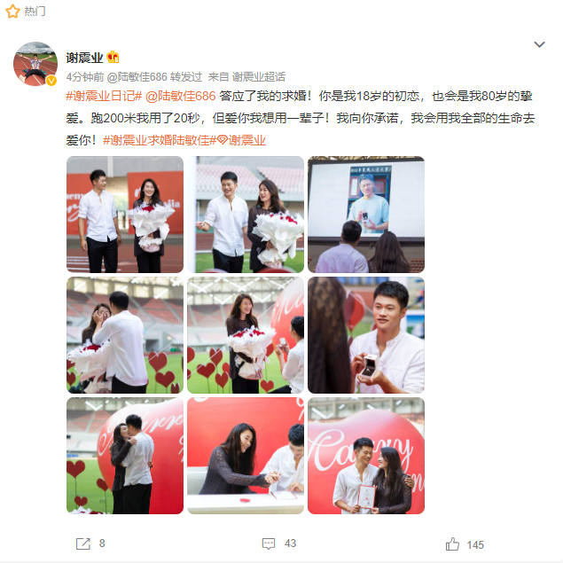 9月9日,与苏炳添并称“短跑双子星”的短跑名将谢震业,在社交媒体上官宣求婚成功相识15年,同为田径运动员的初恋女友陆敏佳。