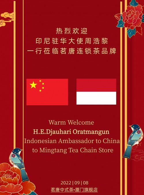 2022年9月8日,值此第二十二届中国国际投资贸易洽谈会在厦门国际会展中心举行之际,印尼驻华大使周浩黎阁下H.E Mr. Djauhari Oratmangun、大使夫人艾茜薇女士Mrs. Sih Elsiwi Handayani Oratmangun、印尼驻华大使馆经济处二等秘书克里斯那先生Mr. Krisna Puspita Laurensius及印尼驻华大使馆经济处行政技术人员苏琳琇女士Ms. Sheila Sofian等一行,莅临“茗唐”连锁茶品牌厦门旗舰店参观考察,并进行深度的沟通与了解。