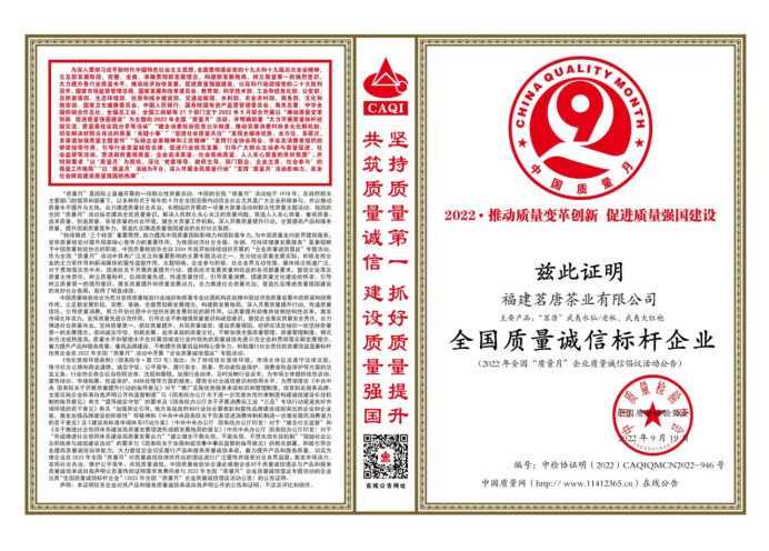 在今年全国“质量月”活动中,福建茗唐茶业有限公司踏着迈向高质量发展的铿锵步伐,凭借强劲实力荣获由中国质量检验协会颁发的“全国质量诚信标杆企业”、“全国茶业行业质量领先品牌”和”全国质量检验稳定合格产品”三大荣誉证书。荣获此次殊荣,不仅是行业和权威机构对茗唐茶企的高度认可,更是对茗唐产品质量的极大肯定。