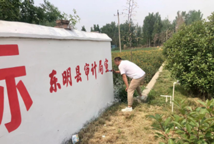 近日,走在东明县菜园集镇祥寨行政村的大街小巷,一条条醒目的宣传标语,一幅幅体现时代精神的精美壁画映入眼帘。在每条标语、每副壁画右下方标注着“东明县审计局宣/制”。