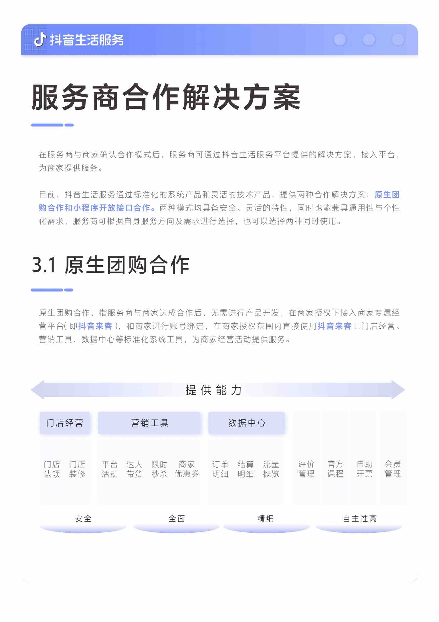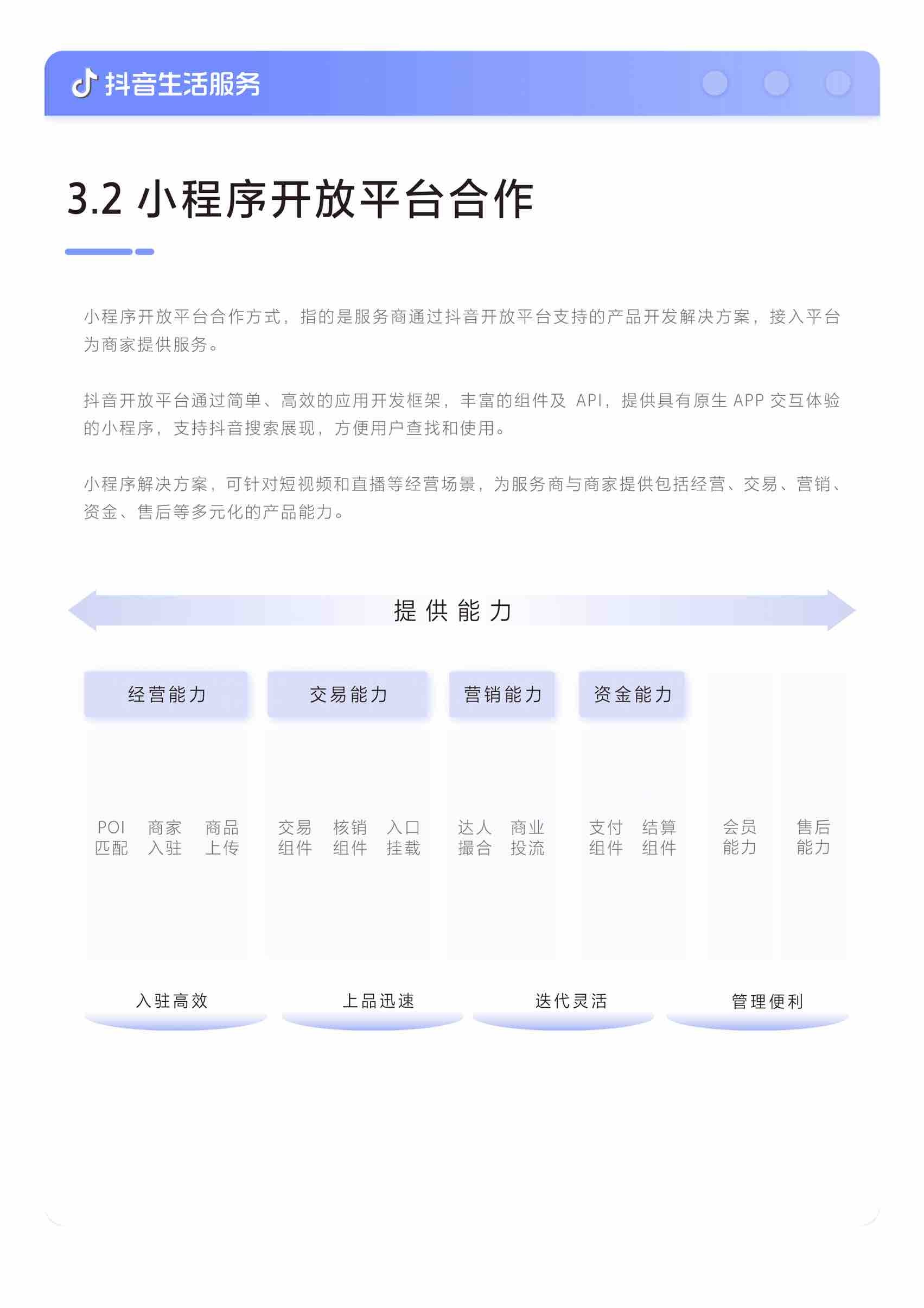 第二种解决方案是抖音生活服务提供的灵活的技术产品——小程序开放平台。服务商通过接入小程序开放平台为商家提供服务。