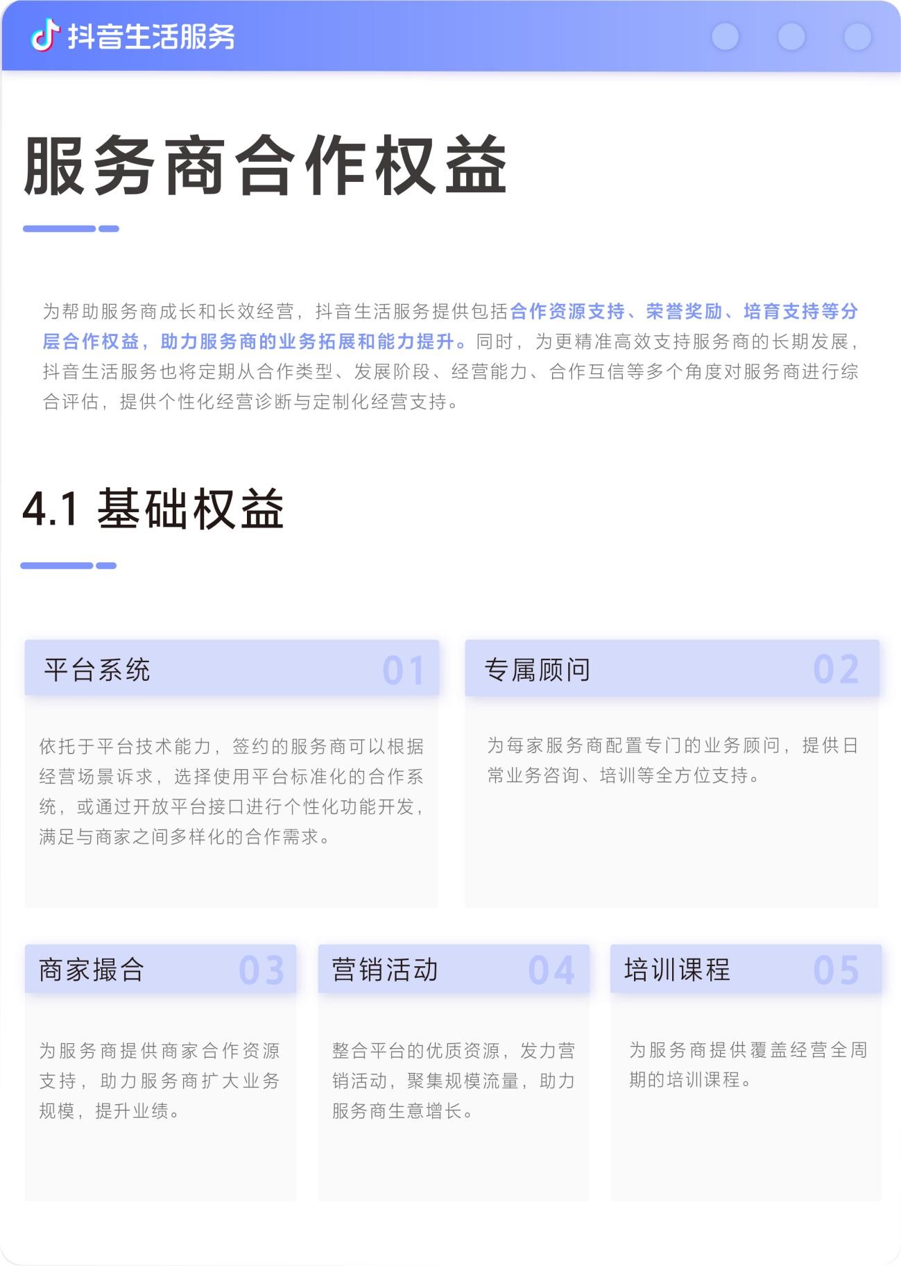 服务商的基础权益包括平台系统、专属顾问、商家撮合、营销活动、培训课程等全方位支持,满足其与商家之间多样化的合作需求。