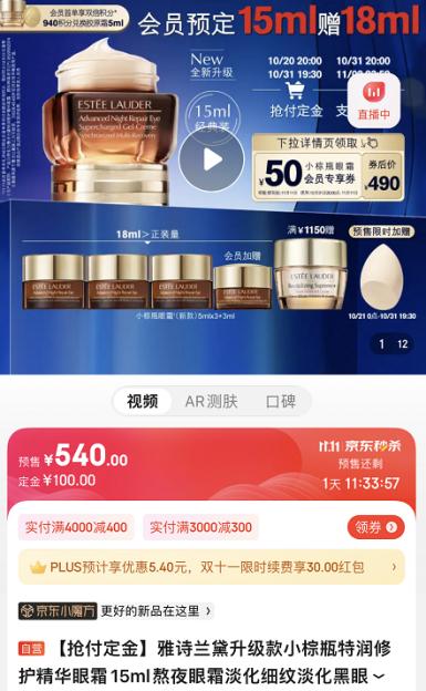 长时间面对电子屏、熬夜晚睡等都容易变成“熊猫眼”,想要改善这一状况,雅诗兰黛小棕瓶眼霜堪称不二选择。无论是青色、紫色还是棕色的黑眼圈,小棕瓶眼霜都是它们的命中克星。试验数据显示,这款眼霜对于三色四区的黑眼圈都能精准淡褪,而且只需两周即可看到明显效果,超适合爱玩手机、爱熬夜的小仙女们。京东新百货的这款雅诗兰黛小棕瓶眼霜,买15ml赠18ml,11.11会员到手价490元。