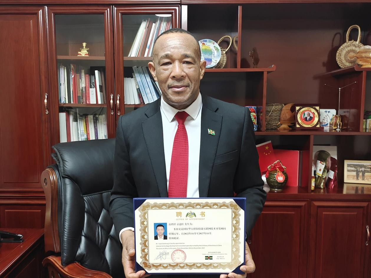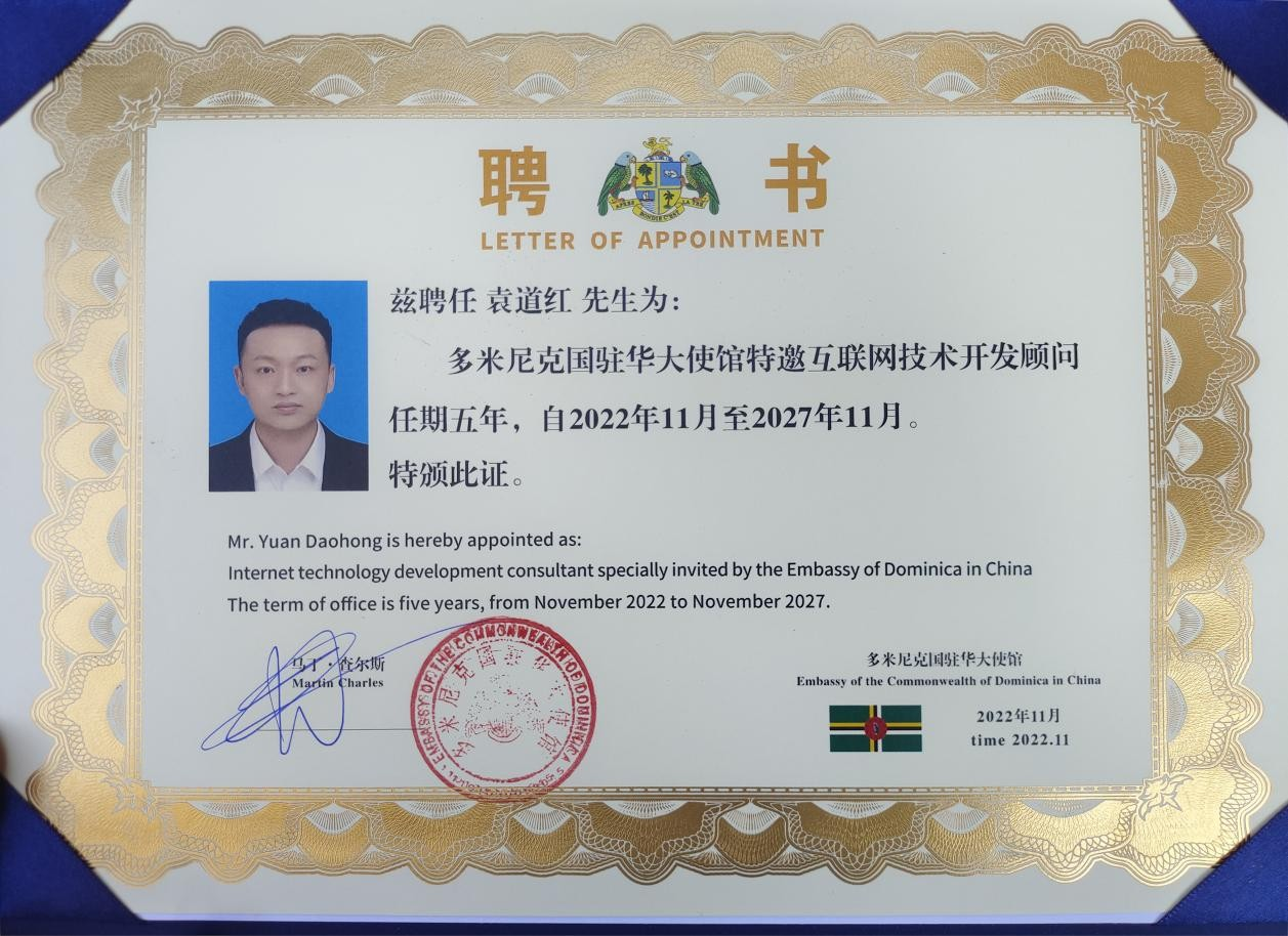 据悉,2022年11月3日,受多米尼克国驻华大使馆邀请,农夫铺子集团董事会主席袁道红前往多米尼克国驻华大使馆与大使马丁•查尔斯先生就互联网平台入驻方面问题进行会晤,本次会晤深入探讨了在互联网技术运用方面如何加快多米尼克国全方位发展,怎样就多米尼克国情制定数字经济发展战略等方面进行友好交流。也因此,袁道红先生特受多米尼克驻华大使邀请,成为多米尼克国驻华大使馆特邀互联网技术开发顾问,并颁发聘书。