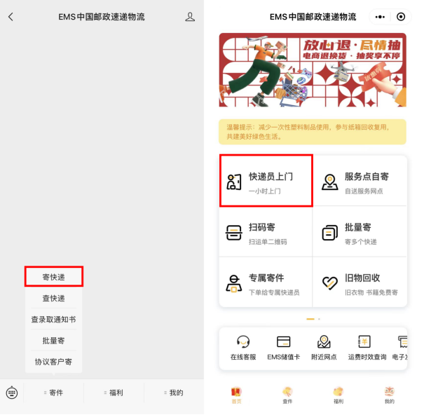 即日起至12月31日,通过EMS公众号或小程序下单寄件,即赠优惠券包,运费累计最高可减102元,不论是寄合同文件、购物退换货,还是赠送圣诞、跨年心意好礼,都能劲享折扣。