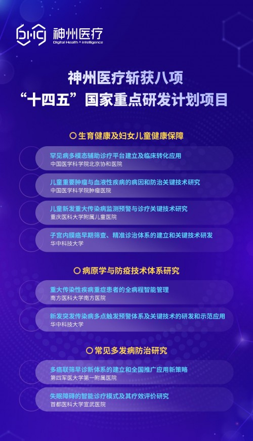 为落实“十四五”期间国家科技创新工作,神州医疗响应国家有关重点专项部署安排,有幸荣获科技部2022年度国家重点研发计划3大专项8个方向项目:“生育健康及妇女儿童健康保障”、“病原学与防疫技术体系研究”、“常见多发病防治研究”。通过上述项目的实施将分别为实现妇女儿童健康监控与重点疾病诊疗智能化、标准化和服务水平同质化,大幅提升对未知和突发病原的发现与抵御能力,全面提高我国常见多发疾病的诊治水平、降低致残致死率、减少疾病负担,贡献公司优势力量。